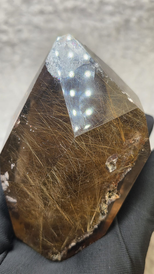 This exquisite crystal combines Golden Rutiles, Phantom layers, and Smoky Quartz, creating a rare union of wealth, grounding, and transformation.