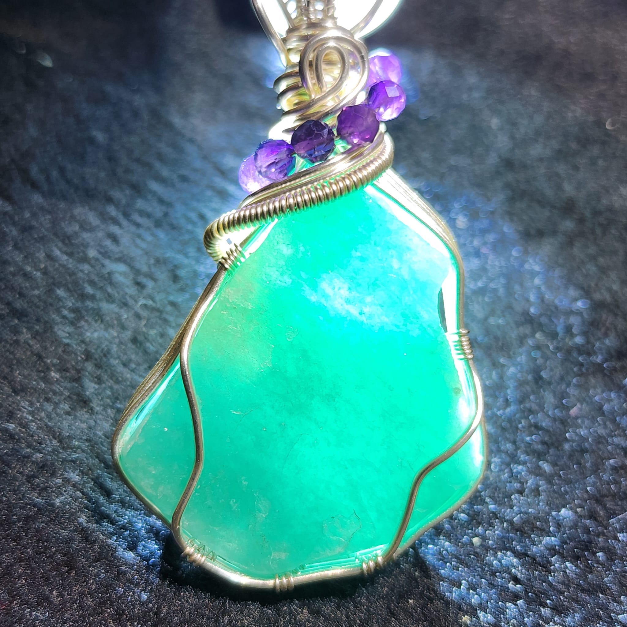Handcrafted with love, this unique wire-wrapped pendant features natural raw Amazonite, accented with Amethyst beads for an extra touch of beauty and energy.