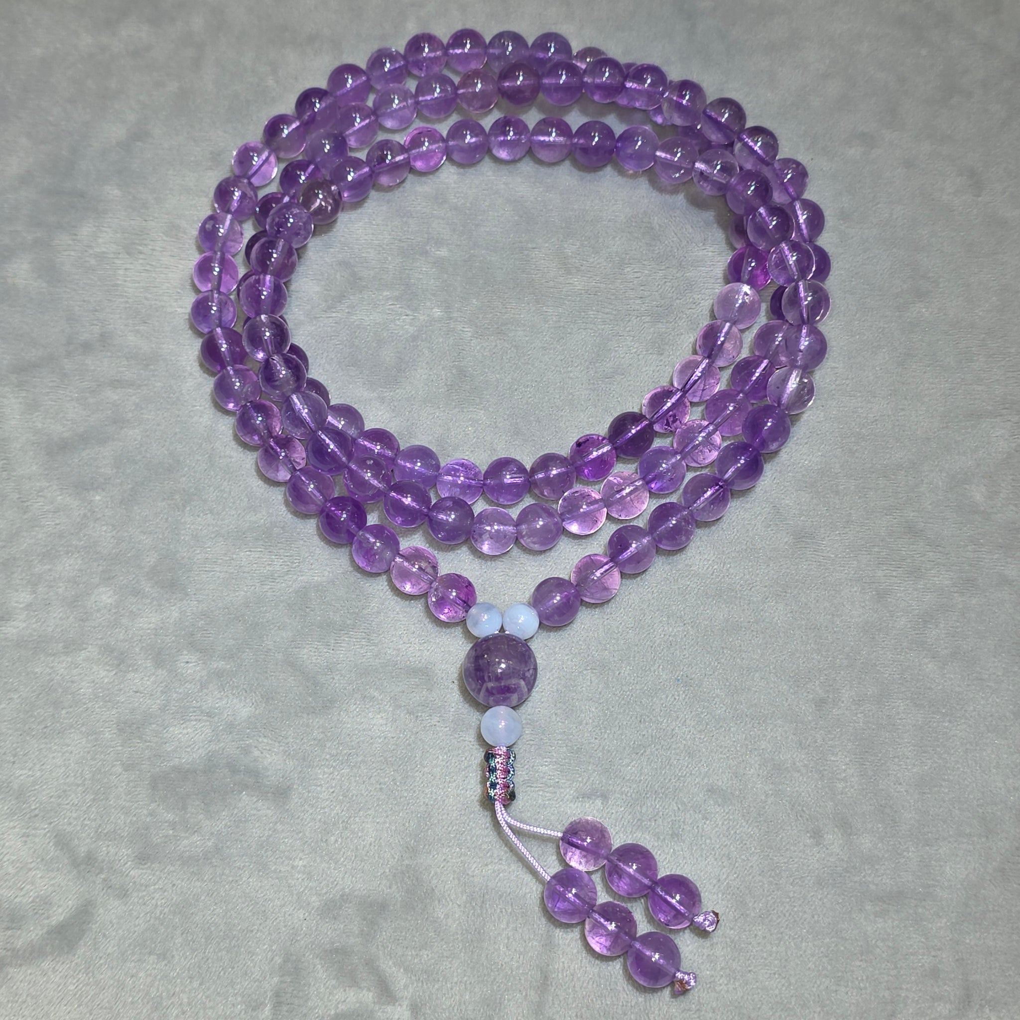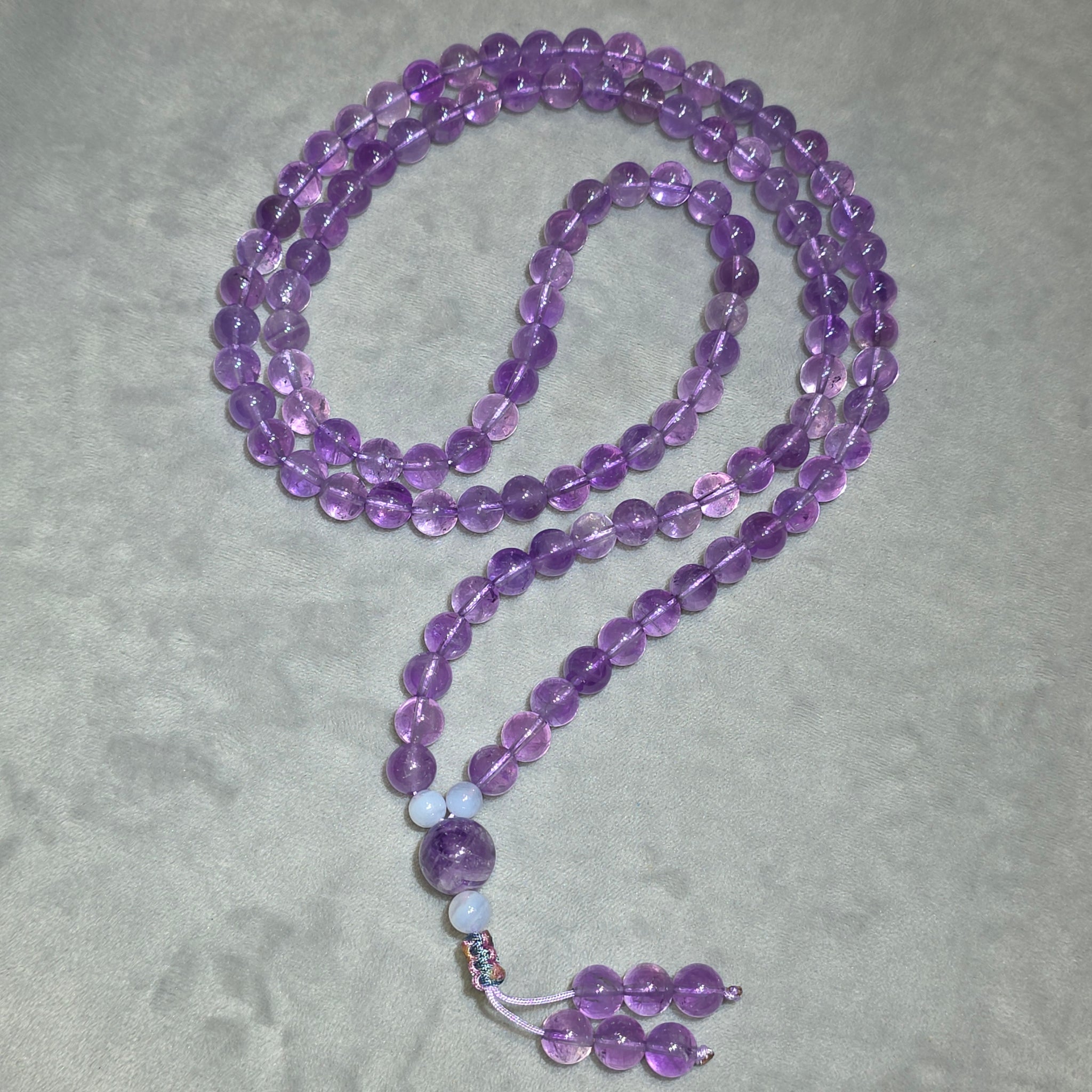 Whether worn as a necklace or used as a meditation tool, this mala supports inner peace, intuitive clarity, and energetic protection, while its rich purple hue adds a sense of elegance and serenity to everyday wear.
