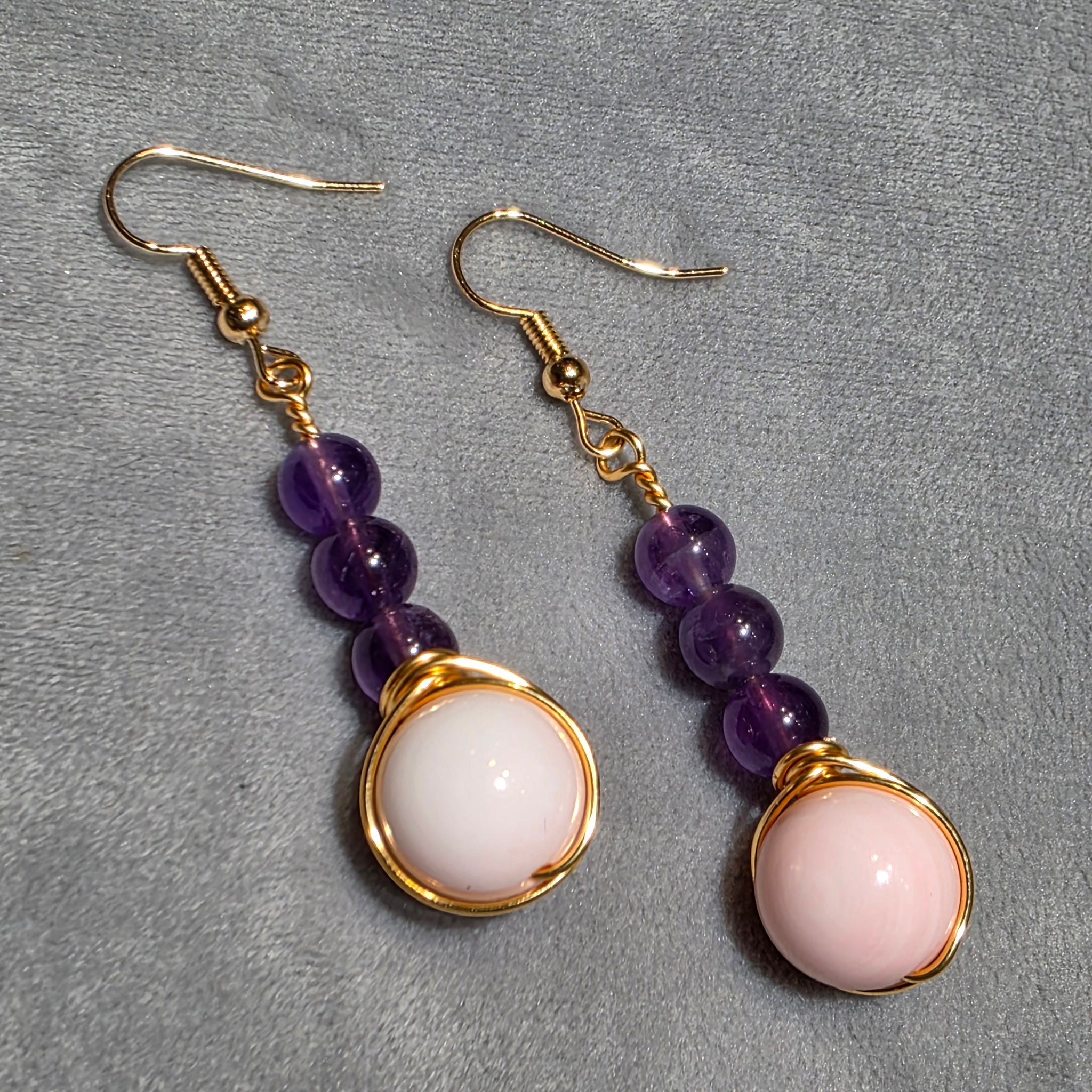These Amethyst & Pink Tridacna Earrings combine spiritual serenity with soft feminine elegance. Amethyst is cherished for its calming and protective qualities, believed to ease stress, promote clarity, and support emotional balance. Paired with Pink Tridacna, known for its nurturing and peaceful energy, this design creates a harmonious blend of beauty and intention.