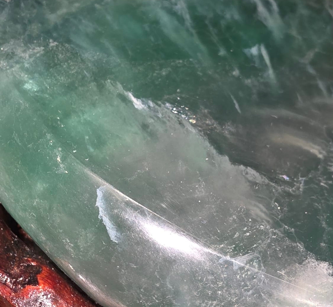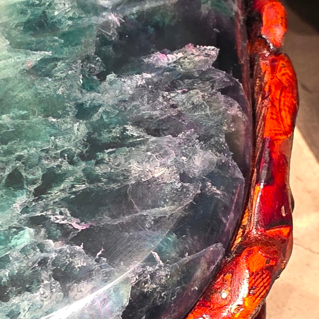 This Fluorite Stool is a rare crystal furniture piece carved from natural Fluorite, showcasing beautiful bands of green, purple, and blue hues. Fluorite is known as the Stone of Clarity, traditionally associated with mental focus, organisation, and energetic cleansing.