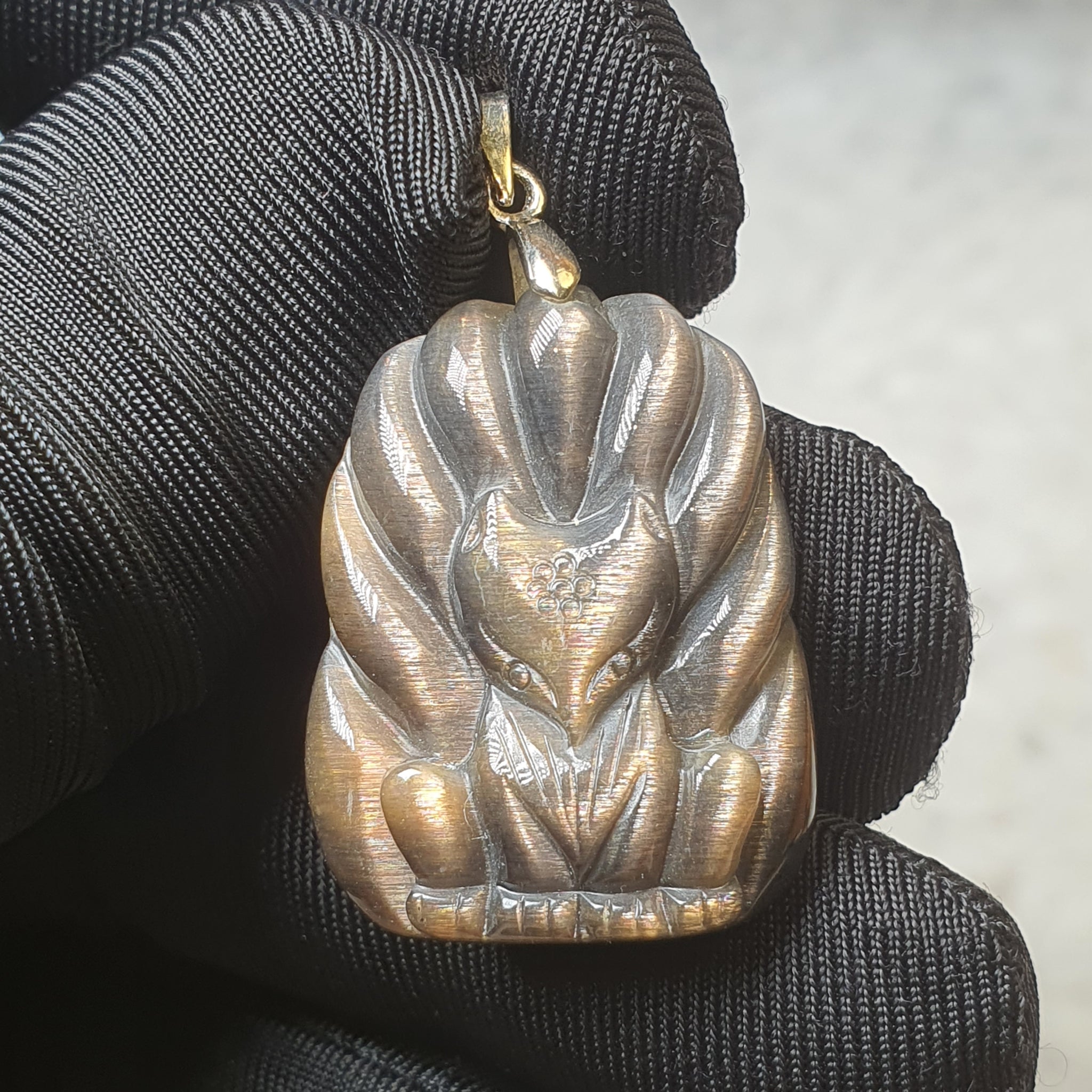 The 9-tailed fox, a legendary symbol in many cultures, is associated with wisdom, protection, and prosperity. Carved from Golden Sunstone, known for its radiant shimmer and uplifting energy, this pendant embodies cleverness, confidence, and abundance.