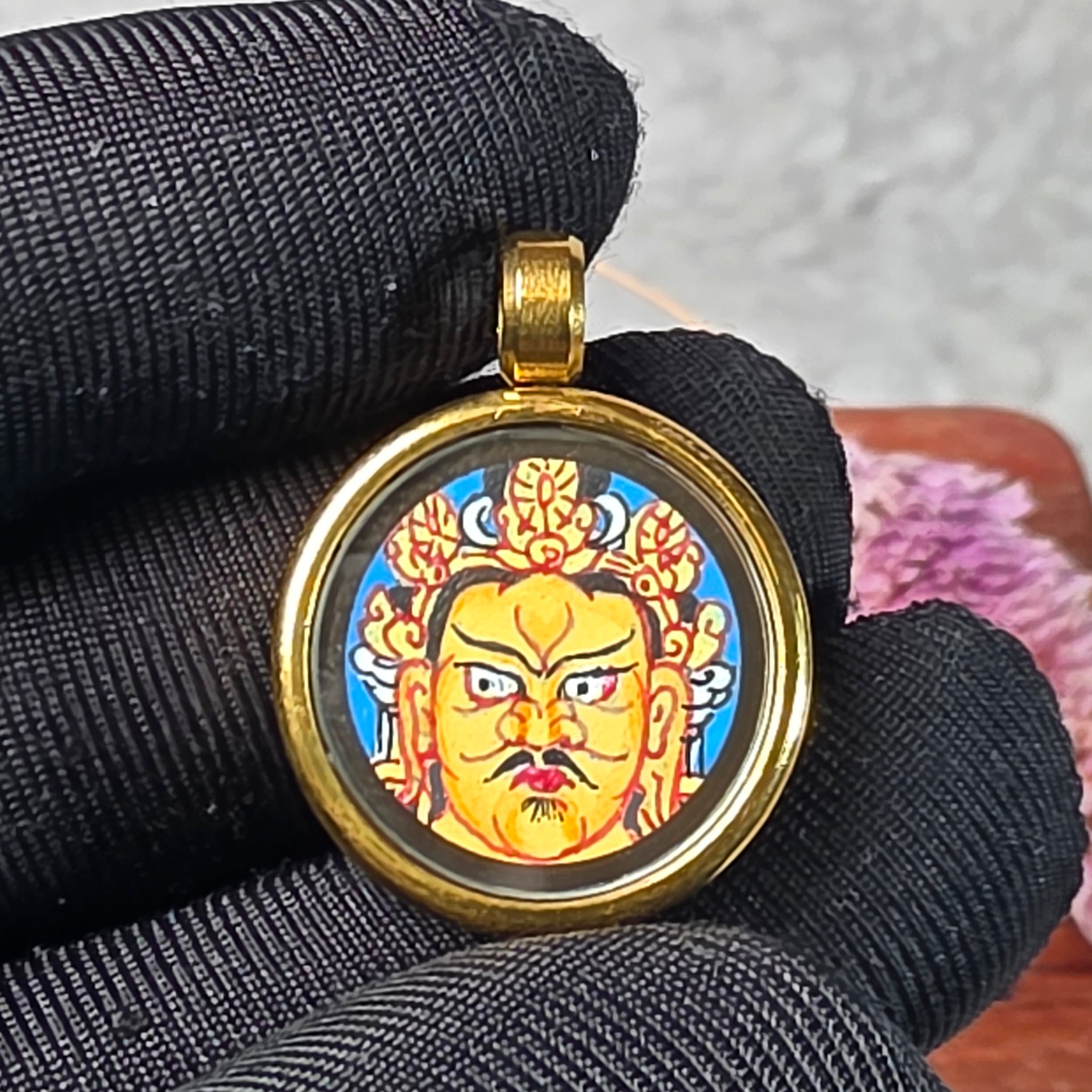 The pendant highlights the detailed hand-painted visage of Yellow Jambhala, often depicted with a fierce yet benevolent expression to bestow wealth and protection. Devotees believe that wearing Yellow Jambhala imagery brings blessings, good fortune, and support in financial matters.