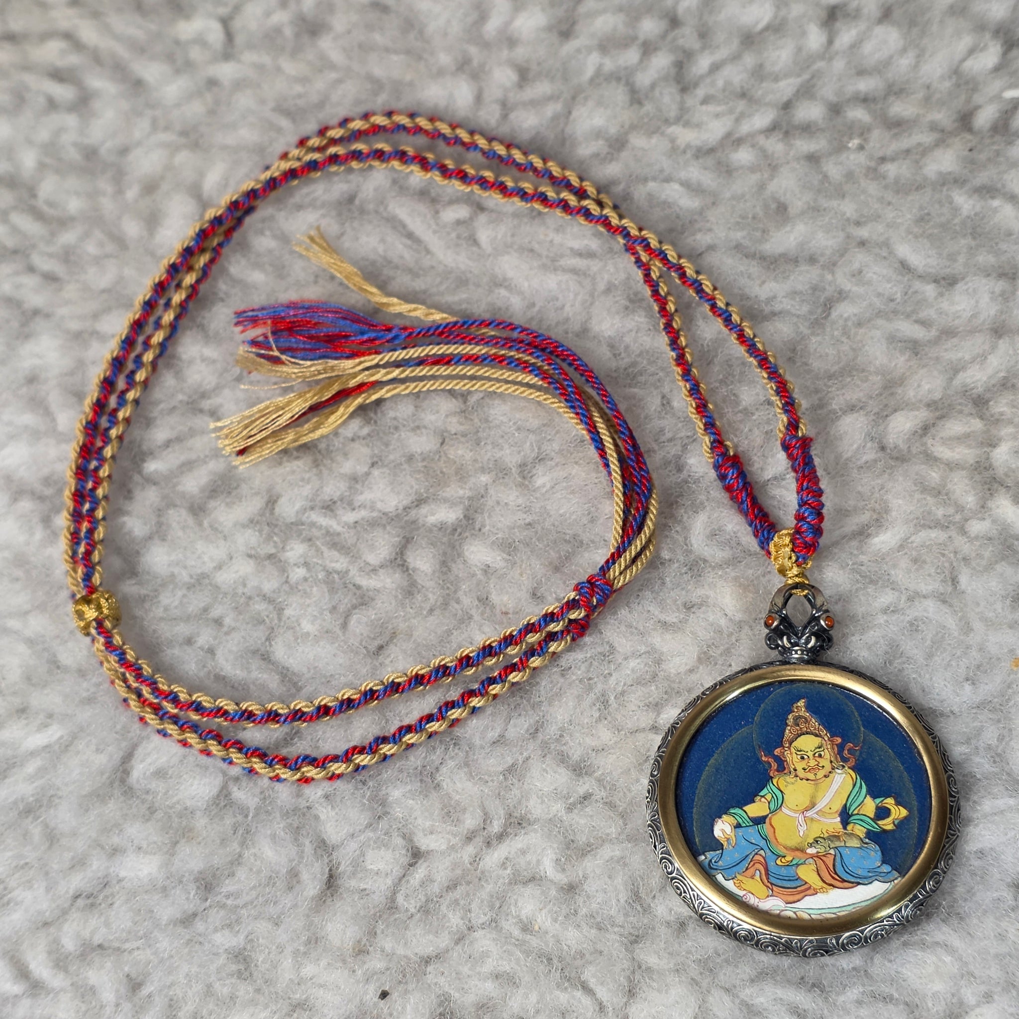 This Hand-drawn Thangka Pendant comes with an included necklace and features Yellow Jambhala (黃財神), the Tibetan Buddhist deity of wealth, abundance, and prosperity. Yellow Jambhala is revered for attracting financial stability, removing material obstacles, and bestowing blessings while promoting ethical and spiritual balance.