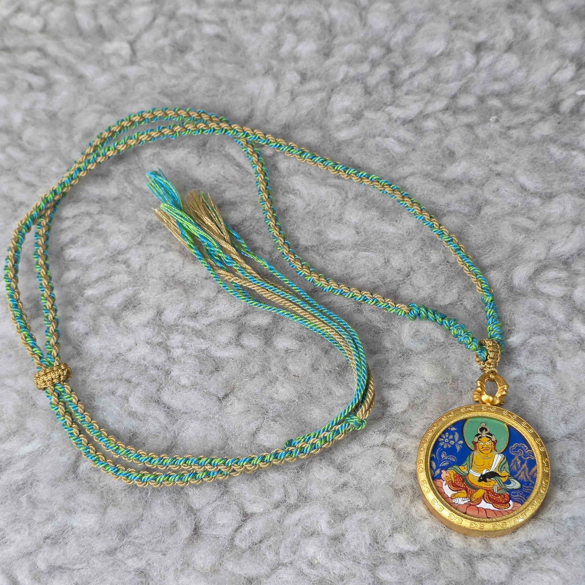 This Hand-drawn Thangka Pendant comes with an included necklace and features Yellow Jambhala (黃財神), the Tibetan Buddhist deity of wealth, abundance, and prosperity. Yellow Jambhala is revered for attracting financial stability, removing material obstacles, and bestowing blessings while promoting ethical and spiritual balance.