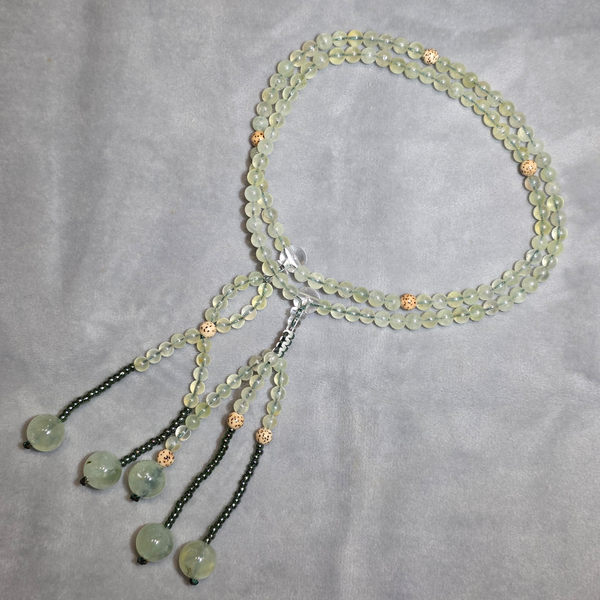 Each bead is carefully strung to create balance between the soothing green glow of Prehnite and the grounding essence of Bodhi, encouraging calm focus and compassionate energy during chanting or meditation.