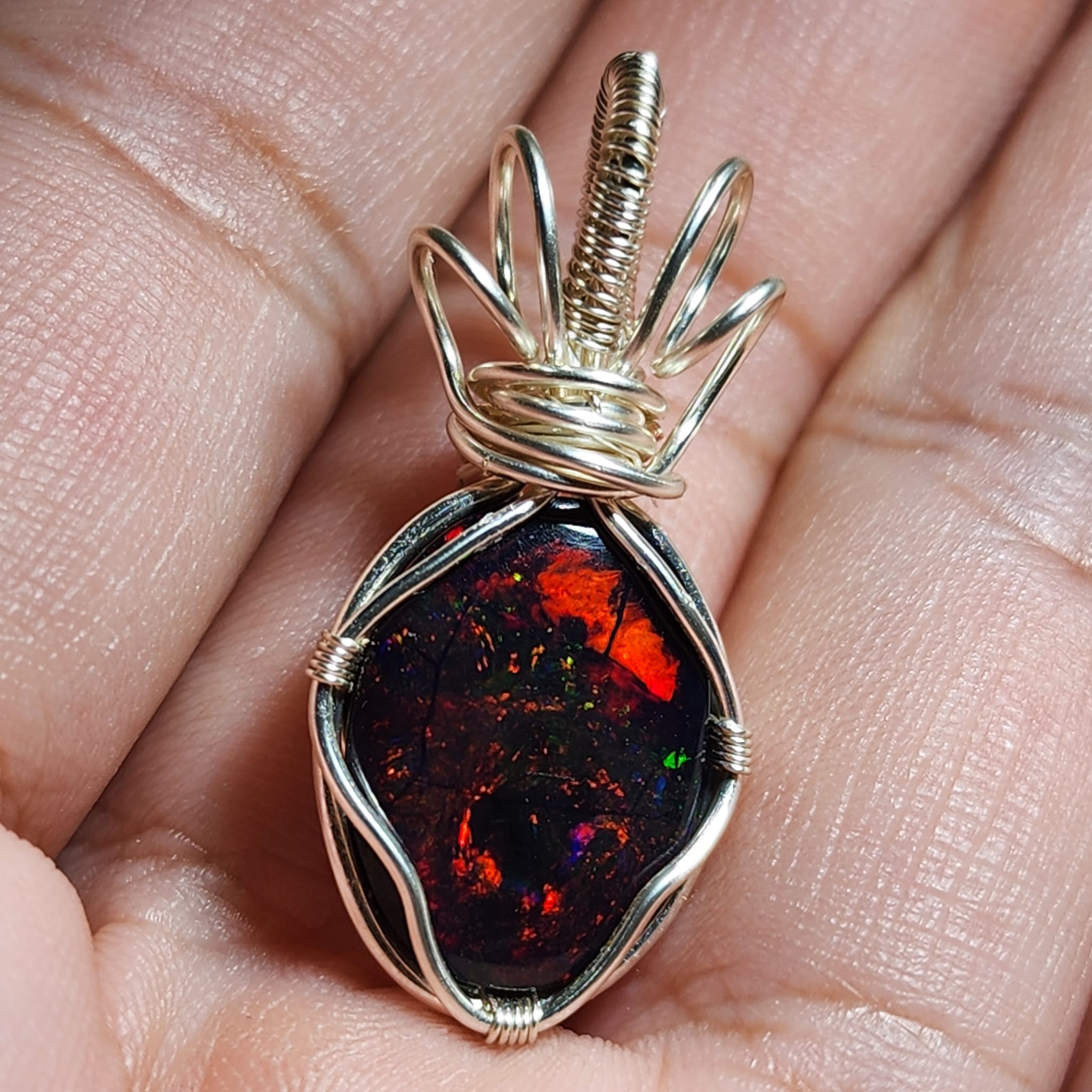 Discover the mesmerizing beauty of our handcrafted Black Opal pendant, wire-wrapped in-house with care. Each stone carries a cosmic play of reds, greens, and blues — unique patterns that make every piece truly one-of-a-kind.