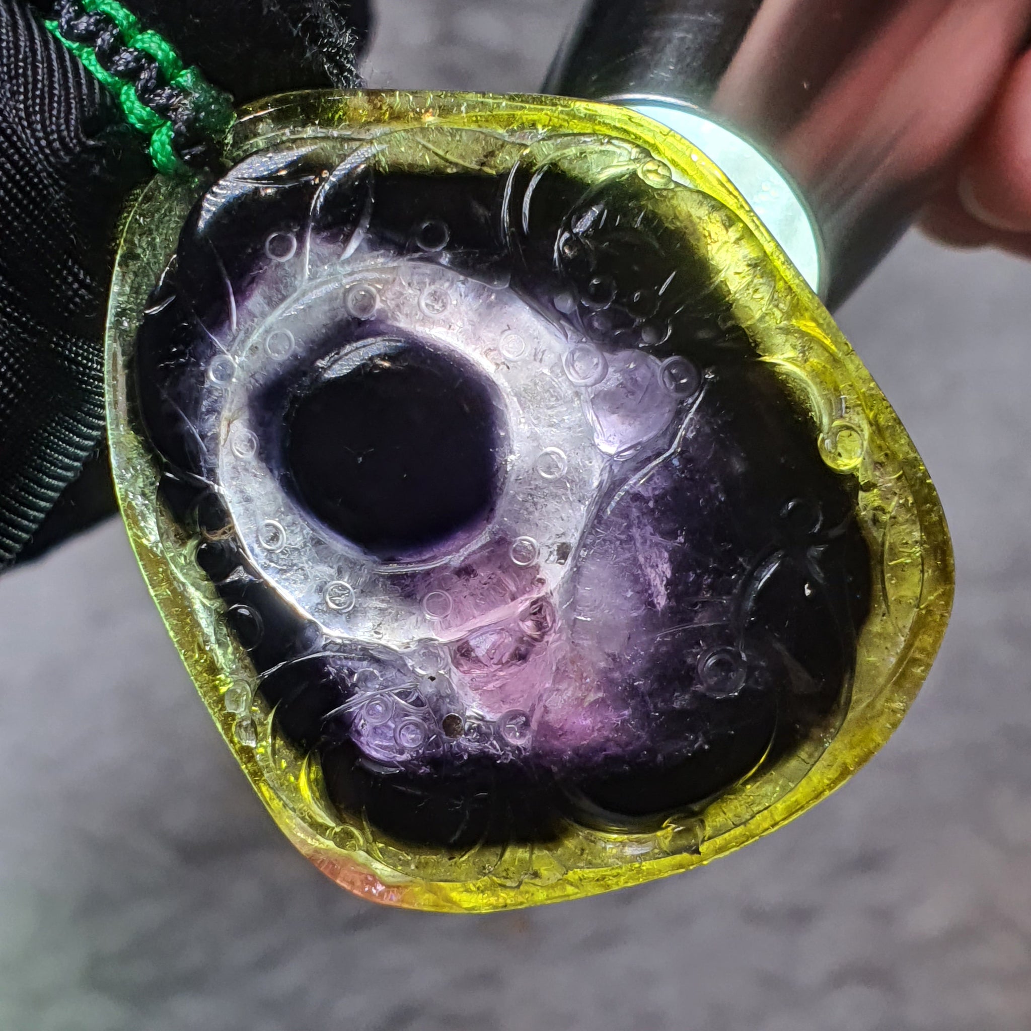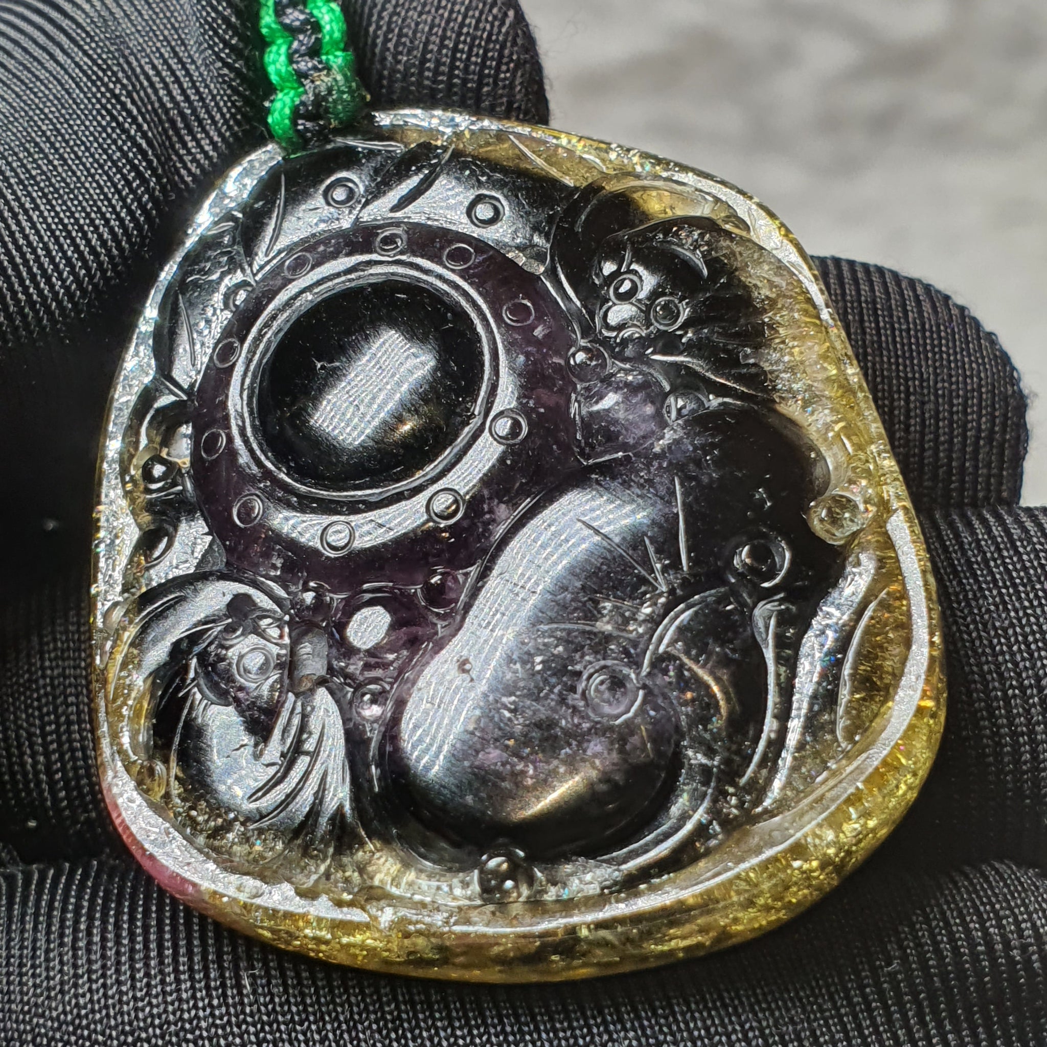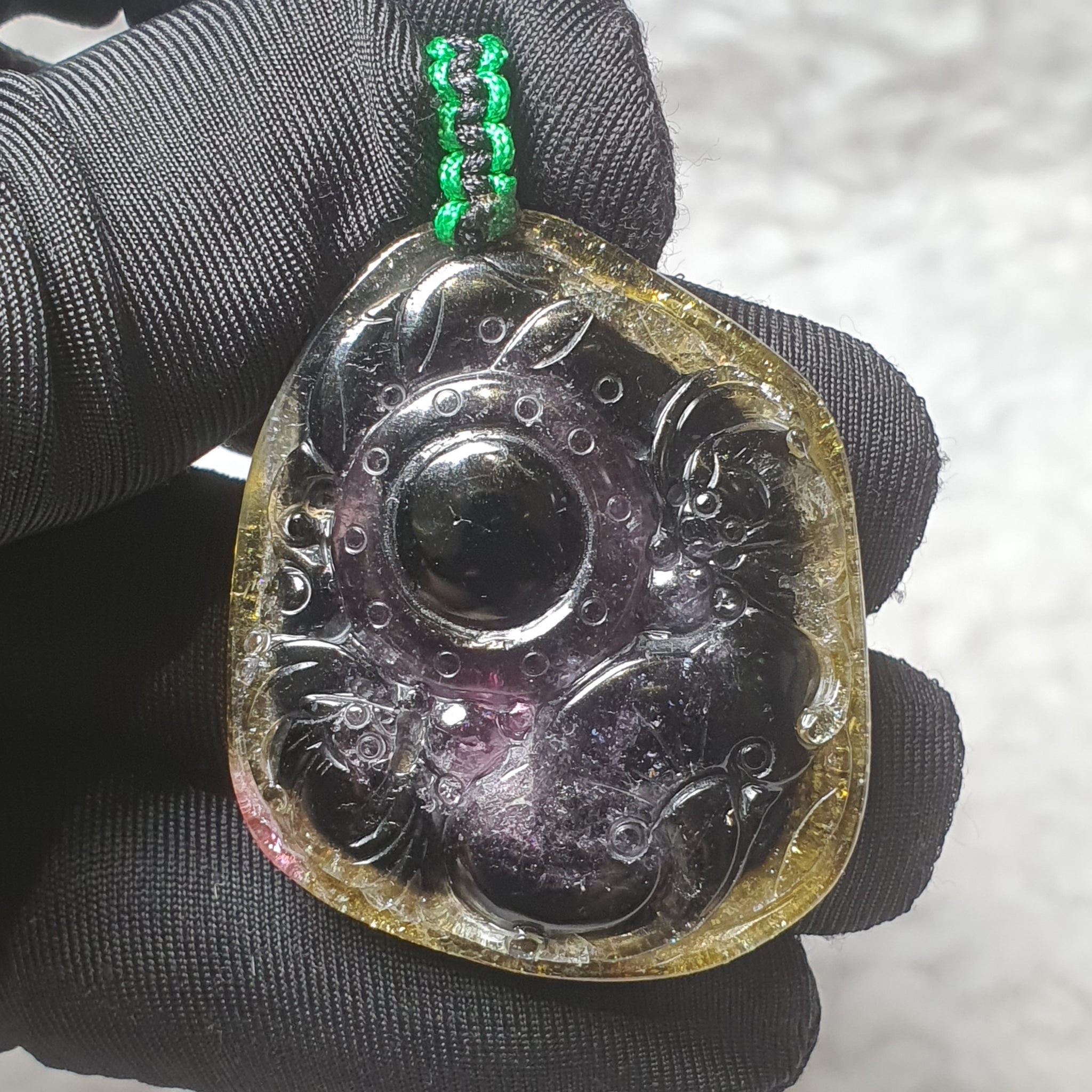 This auspicious carving features bats, coins, and a ruyi, beautifully sculpted from naturally vibrant multi-colour tourmaline. In traditional symbolism, bats represent blessings, happiness, and good fortune, as the word “bat” (福) is associated with prosperity and blessings. Coins symbolise wealth, abundance, and financial stability, while the ruyi signifies smooth progress and fulfilled wishes.