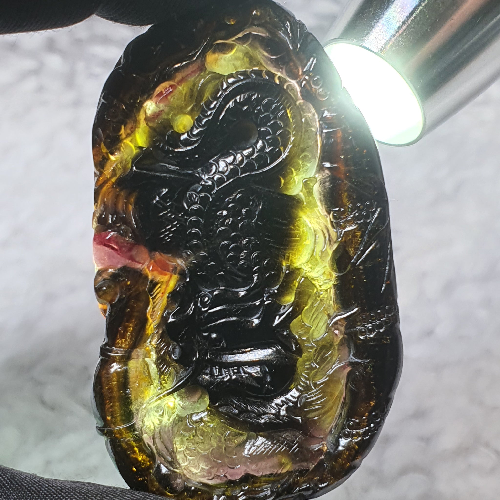 This powerful carving combines three highly auspicious symbols—the dragon, bamboo, and ruyi—beautifully crafted from naturally vibrant multi-colour tourmaline.