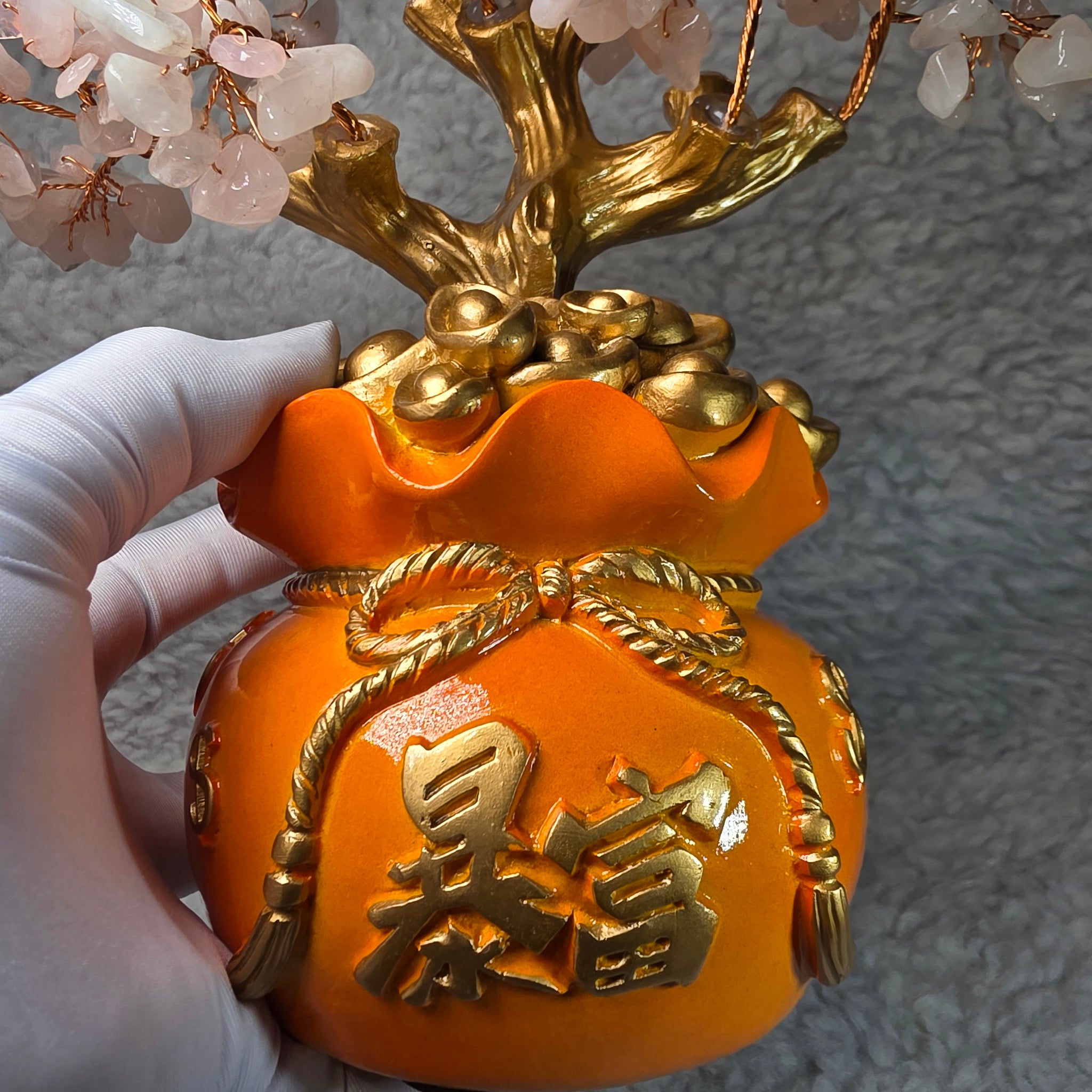 This Rose Quartz Money Bag Tree features polished Rose Quartz crystals arranged as “money bags” on a decorative tree base, symbolizing abundance, wealth, and harmonious energy. In Feng Shui, the money bag represents financial growth and stability, while Rose Quartz adds the vibration of love, harmony, and emotional balance, creating a dual-purpose piece that nurtures both prosperity and heart energy.