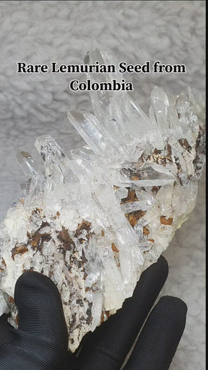 This stunning Lemurian Seed cluster features beautifully clear, striated points growing naturally on a mineral-rich matrix. The golden to brown hues come from Limonite and Goethite, enhancing its grounding and manifesting energy.