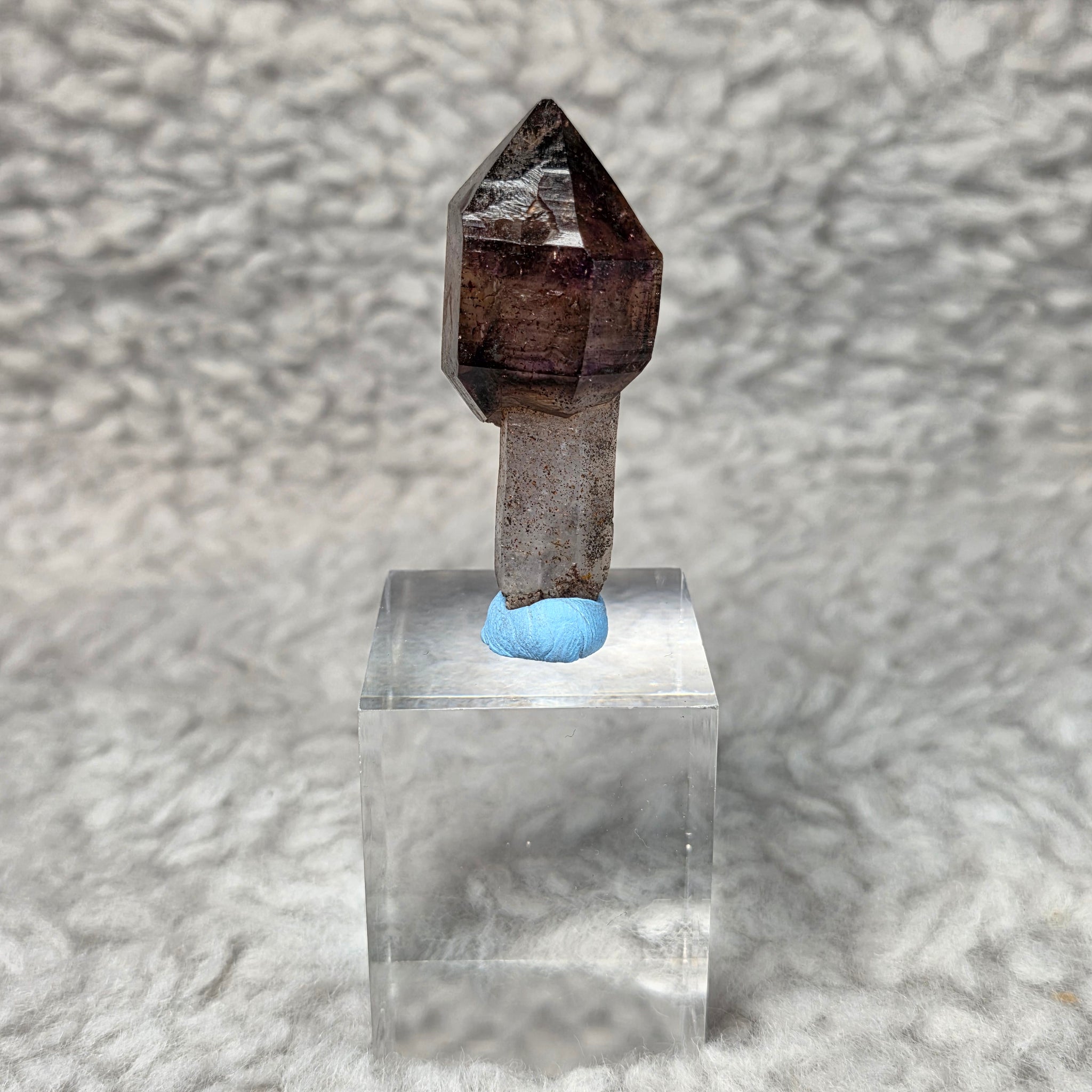 This Super 7 Scepter with Enhydro is a truly extraordinary specimen of Melody Stone, naturally combining seven minerals: Amethyst, Clear Quartz, Smokey Quartz, Cacoxenite, Rutile, Goethite, and Lepidocrocite, with a rare enhydro inclusion—a pocket of water trapped inside the crystal during formation.