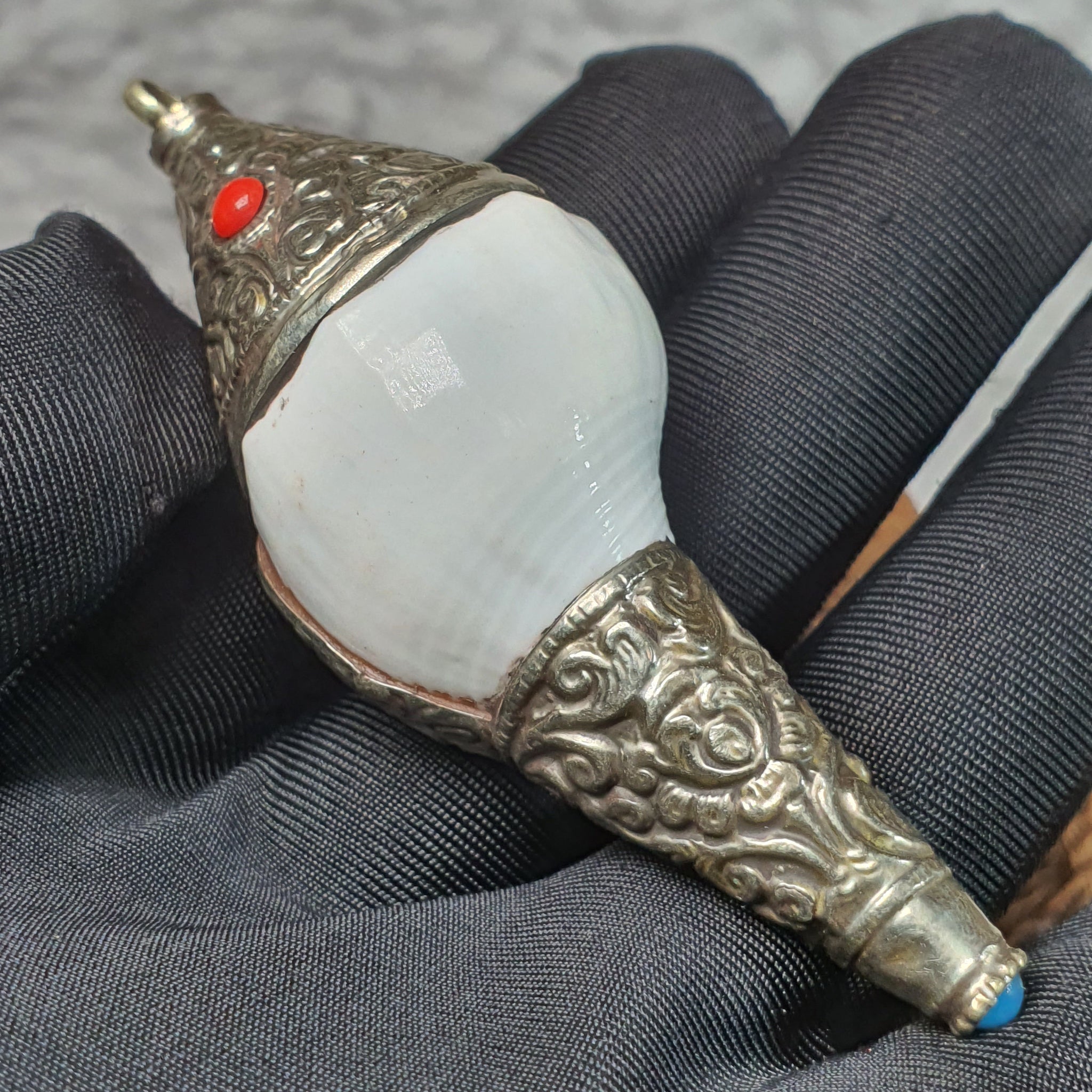 This traditional Tibetan conch shell (Dung-dkar) is a powerful Buddhist symbol representing the voice of Buddha, spiritual awakening, and the spreading of positive Dharma energy.