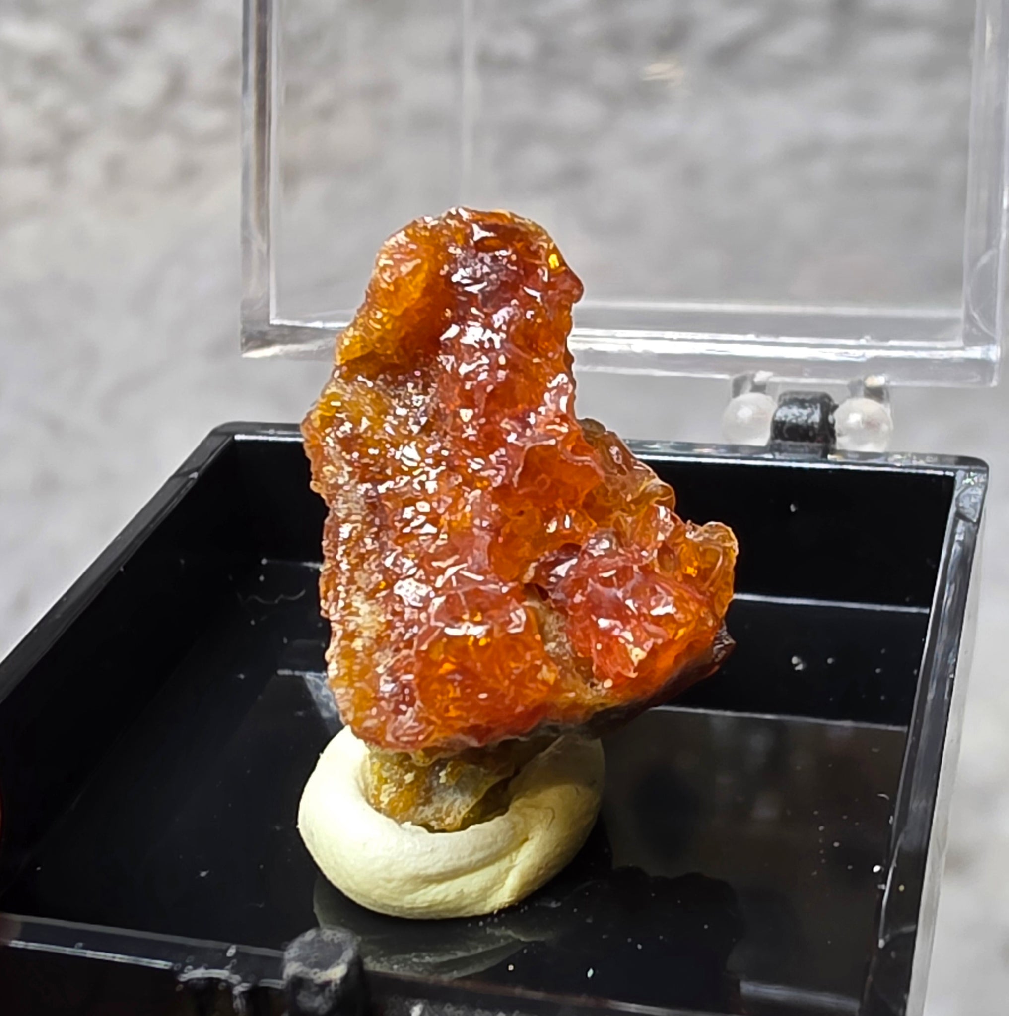 This Zincite specimen from Poland features bright red-orange crystalline formations with sharp terminations and lustrous surfaces. Polish Zincite is highly prized by collectors for its intense colour, natural structure, and rarity, making it a standout piece in any mineral collection.